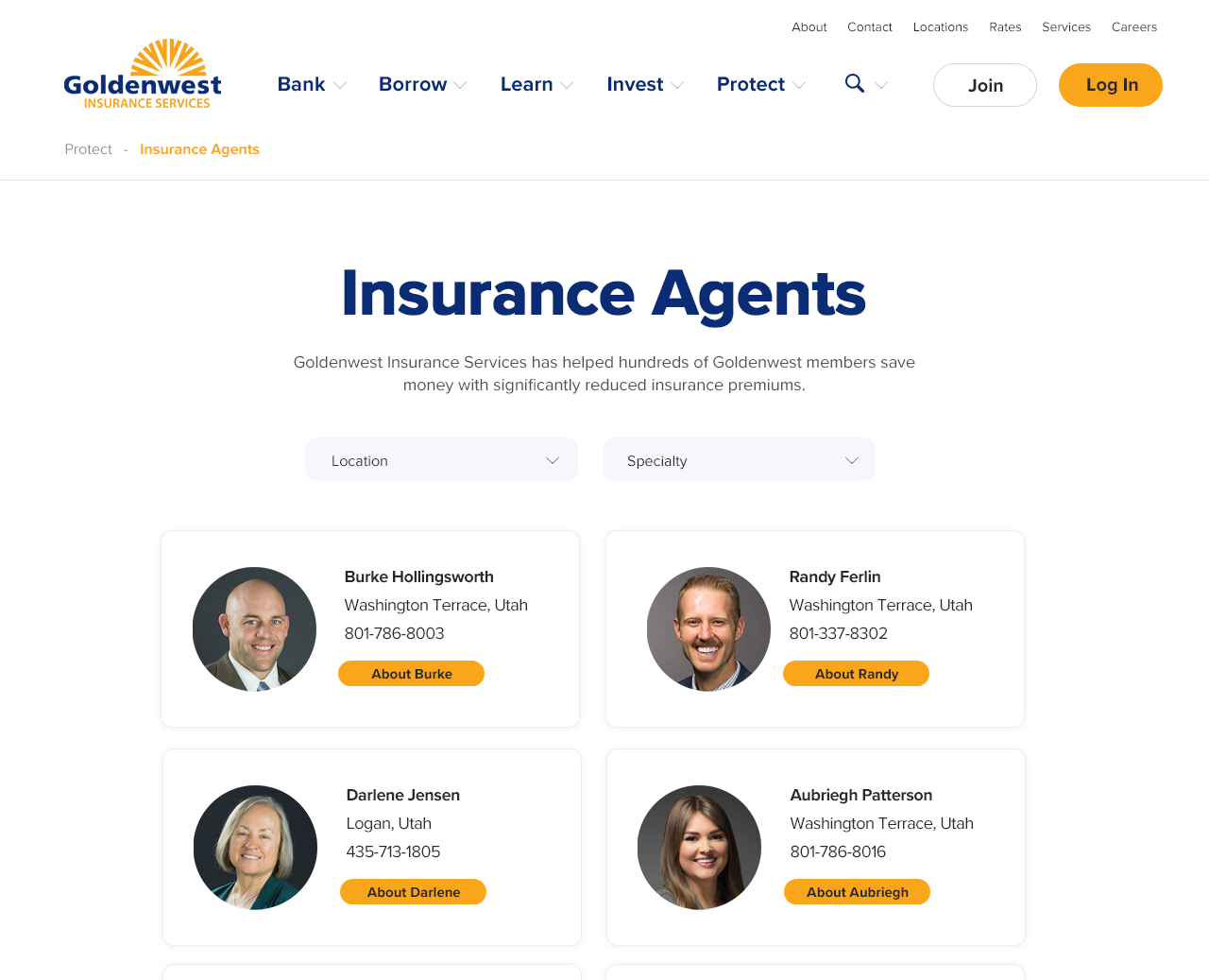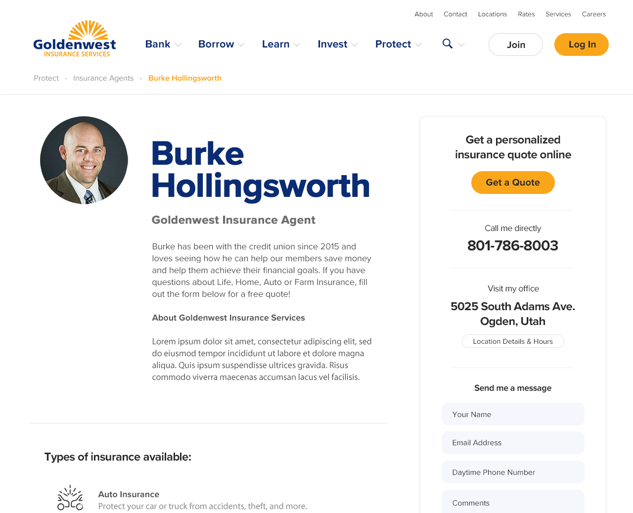 There are certain employees in the credit union that have public-facing jobs - insurance agents and mortgage loan officers for example. I created a feature that gives these employees their own page on the website. The page shows their name, a photo, a short bio, and their contact information. For mortgage loan officers, the page also has buttons for people to apply for a mortgage.