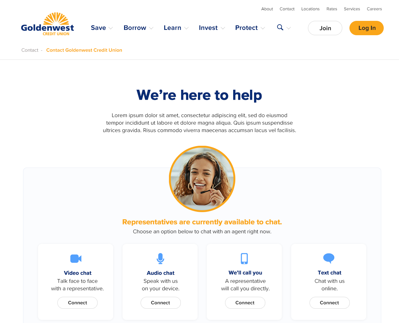 I also wrote some custom Javascript that displays the real-time status of each contact type (chat, voice, video) on the Contact us page of the website. This makes the chat feature more visible for people to see what they can do to contact the credit union without looking at the bottom, right corner of the window for the chat icon.